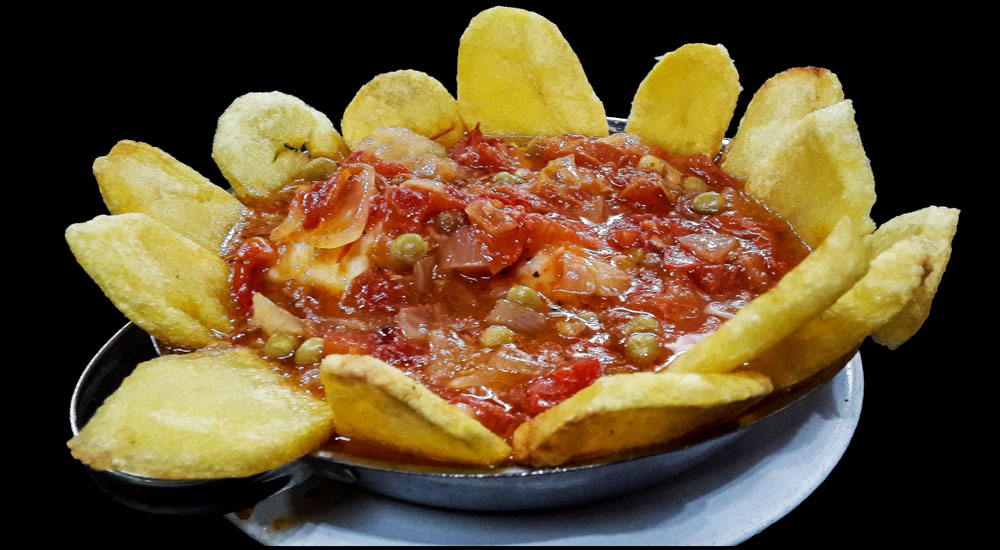 Abadejo, Salsa Portuguesa, Arvejas, Papas a la Española.